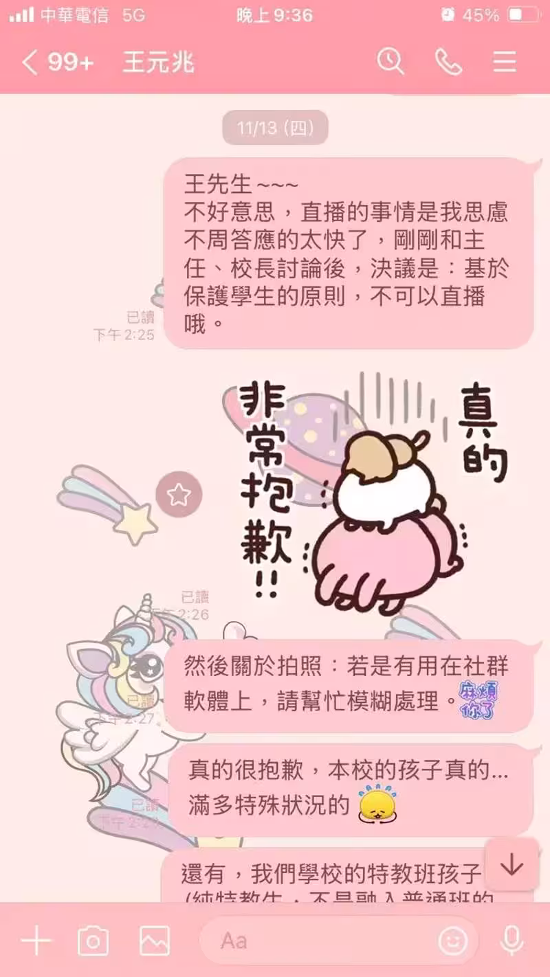 校方秀出老師和魔術師可樂的對話截圖,表示已明確告知「不得進行直播」。