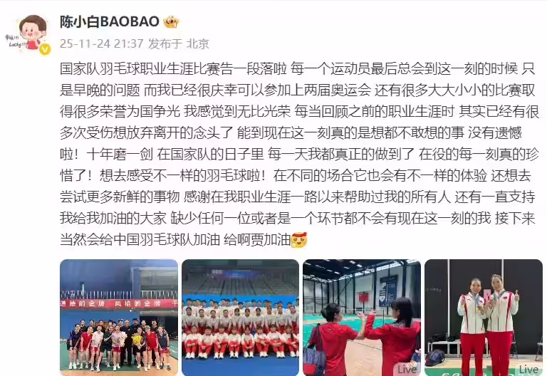 2025年11月24日,奧運冠軍陳清晨通過個人微博正式宣布告別國家隊,以「無憾」二字為11年職業生涯畫上圓滿句號。這位女雙全滿貫得主的從容轉身,引發全網集體致敬,其拼搏與傳承的故事成為中國體壇的溫暖註腳。
