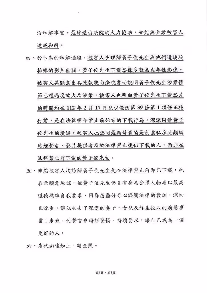」聲明指出,由於案件涉及兒少,被害人個資全程受到保護,因此黃子佼完全無從主動接洽,最終是透過法院的協助才與全數被害人達成和解。