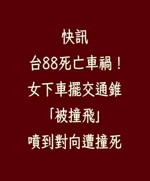 快訊/台88死亡車禍!女下車擺交通錐「被撞飛」 噴到對向遭撞死。