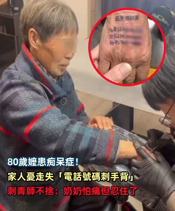 中國一位80多歲奶奶得了嚴重的老人痴呆症,曾經走丟過一次,晚輩擔心她再次走失,決定帶奶奶去刺青,把家人的聯絡方式刺在她手背上。