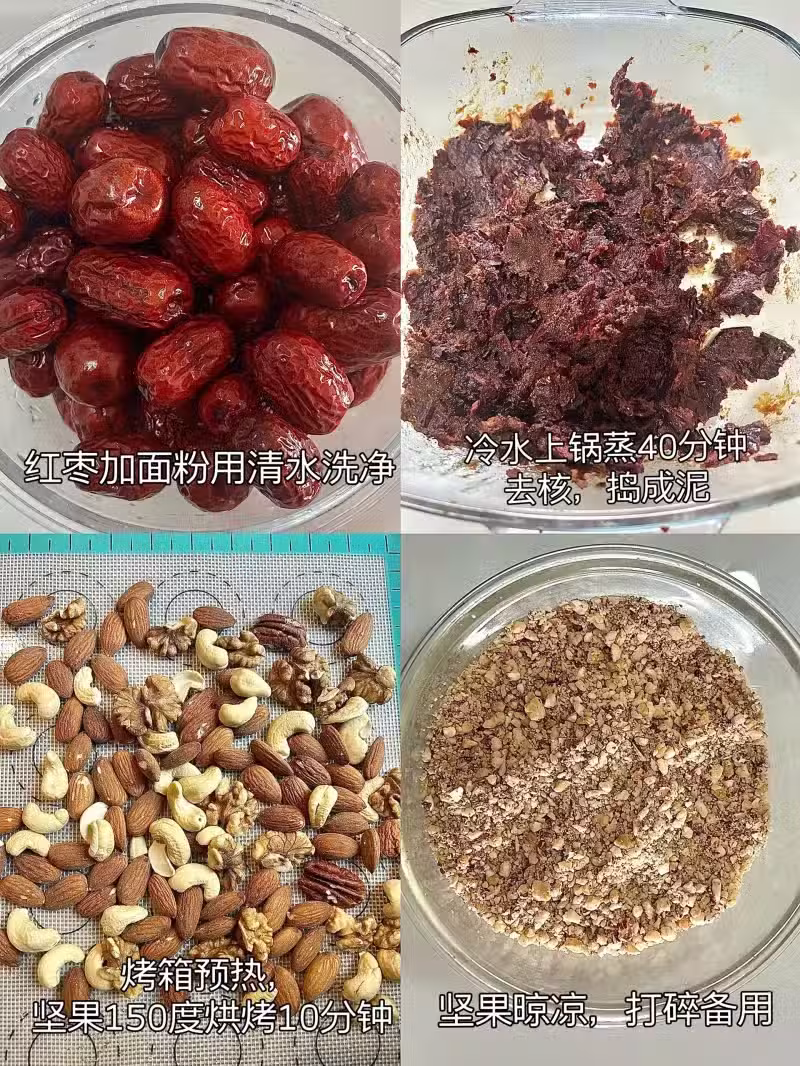 4️⃣依次加入黑芝麻核桃黑豆粉,堅果碎和紅棗泥,把所有材料混合成團,搓成小球或切片