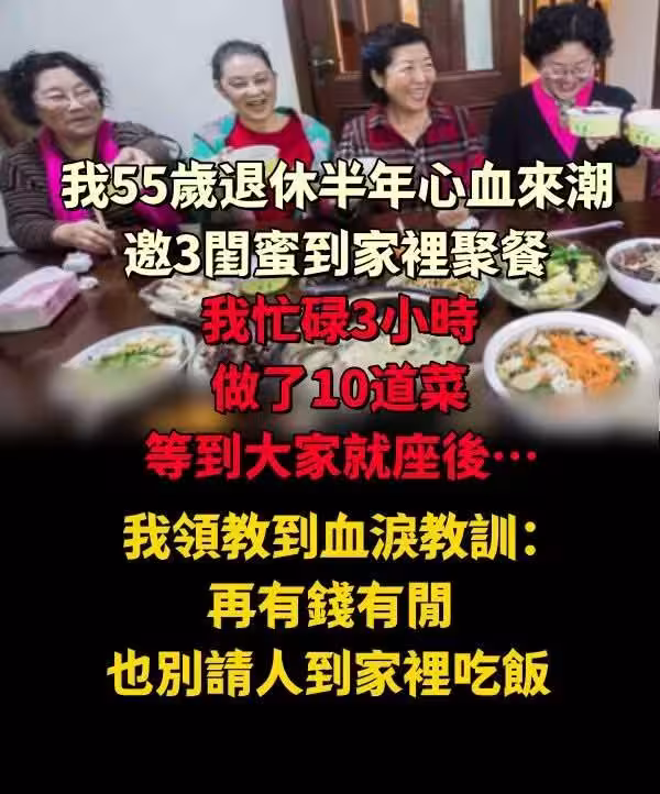 我55歲退休半年, 心血來潮邀3閨蜜到家裡聚餐,我忙碌3小時、做了10道菜,等到大家就座後…我領教到血淚教訓:再有錢有閒,也別請人到家裡吃飯