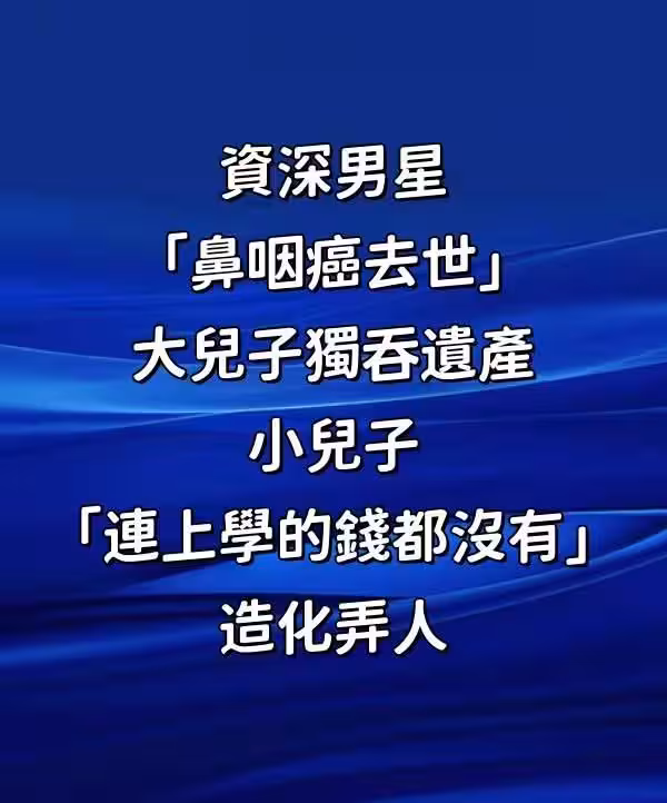 資深男星「鼻咽癌去世」!大兒子獨吞遺產 小兒子「連上學的錢都沒有」:造化弄人。