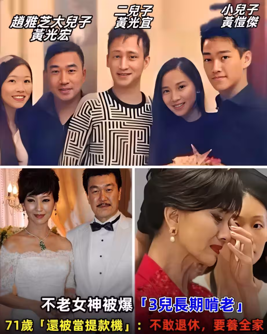 實際上,趙雅芝並不是不想休息,而是有三個兒子啃老30年,「白娘子」淪為提款機。就有香港媒體爆料,趙雅芝的兒子們已成為她甩不掉的包袱,先來說大兒子黃光宏,他拿著媽媽的錢,在黃金地段開餐館、聘請名廚,結果卻是虧光本金,最後,黃光宏只能宅在家裡打遊戲,甚至連買遊戲裝備的錢,還是要靠母親賺取。