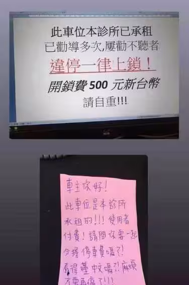 這家診所每個月花錢租用專用車位,卻持續數月遭到不明人士占用。診所人員受訪時表示,他們最初用圍籬阻隔,對方卻直接移開圍籬停車,後來改用電腦列印醒目公告,明確寫著「屢勸不聽者違停一律上鎖,開鎖費500元」,結果車輛依然照停不誤。最後氣得手寫紙條直接質問車主「看得懂中文嗎」,這種無奈的遭遇引髮網友強烈共鳴。