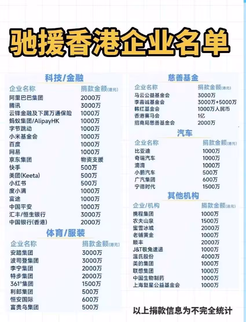 馳援香港的企業眾多,捐款的藝人也不少,甚至楊千嬅把自己首場演唱會的收益拿出來捐給了受災群眾。