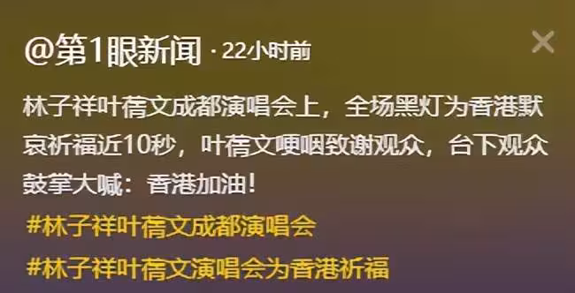 第1眼新聞|林子祥葉蓓文成都演唱會上,全場黑燈為香港默哀祈福近10秒.