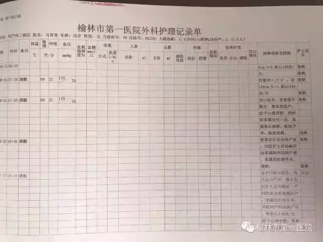 在榆林市第一醫院外科護理記錄單上顯示,17時50分,產婦向醫護人員提出剖腹產的要求,醫護人員徵求家屬意見時,家屬稱表示理解,但拒絕手術,繼續觀察。
