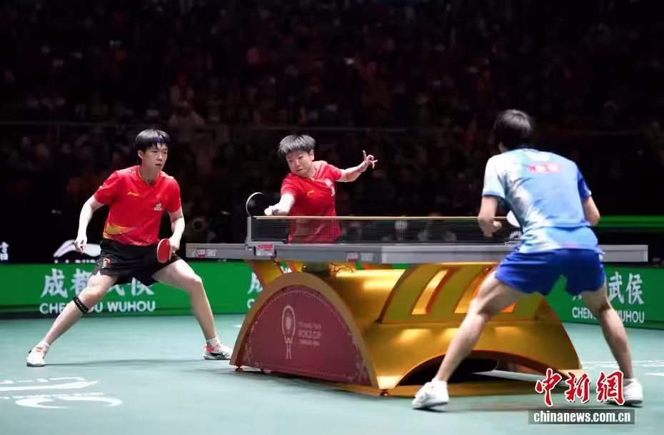 12月6日,四川成都,中國隊隊員王楚欽(左一)與孫穎莎(左二)在混合雙打比賽中。當日,2025年成都國際乒聯混合團體世界盃第二階段比賽中,中國隊以8:5戰勝日本隊。