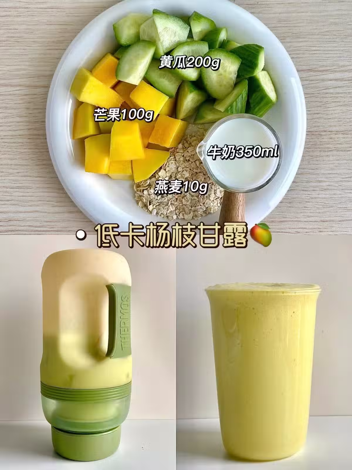即食:燕麥10g+芒果100g+黃瓜200g+牛奶350ml