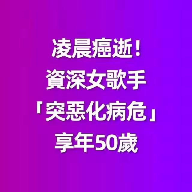 知名女歌手突傳病逝噩耗,在6日凌晨撒手人寰,享年50歲,所屬公司於7日證實死訊,丈夫悲慟喊話:「還是來不及...」