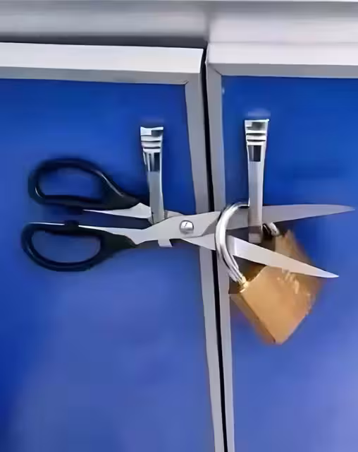 小陳將信將疑,但還是按照張師傅說的,雙手握住兩扇櫃門的把手,稍稍用力向外一拉。神奇的事情發生了——隨著櫃門開啟,那把橫在中間的剪刀自然地順著門縫滑落,「啪嗒」一聲掉在地上,掛鎖也隨之脫落。