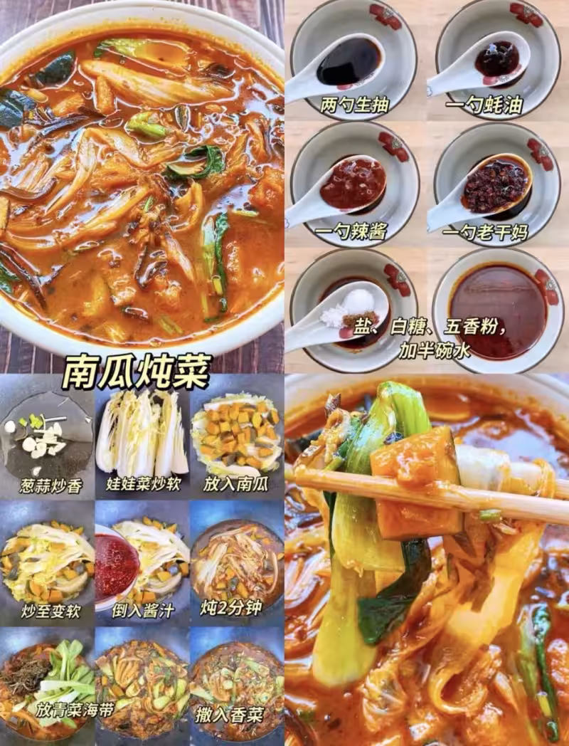 先把蔥蒜炒出香,娃娃菜和南瓜慢慢炒軟,再倒入用辣醬、老乾媽調的紅亮醬汁,小火咕嘟一會兒,讓南瓜的甜糯和娃娃菜的清甜都融進湯里,最後丟一把青菜和海帶,撒上香菜提香。軟乎乎的南瓜吸滿了醬香,娃娃菜帶著微微的辣意,每一口都是熱乎乎的滿足感,像在寒天裡抱了個暖乎乎的小太陽,暖胃又暖心~