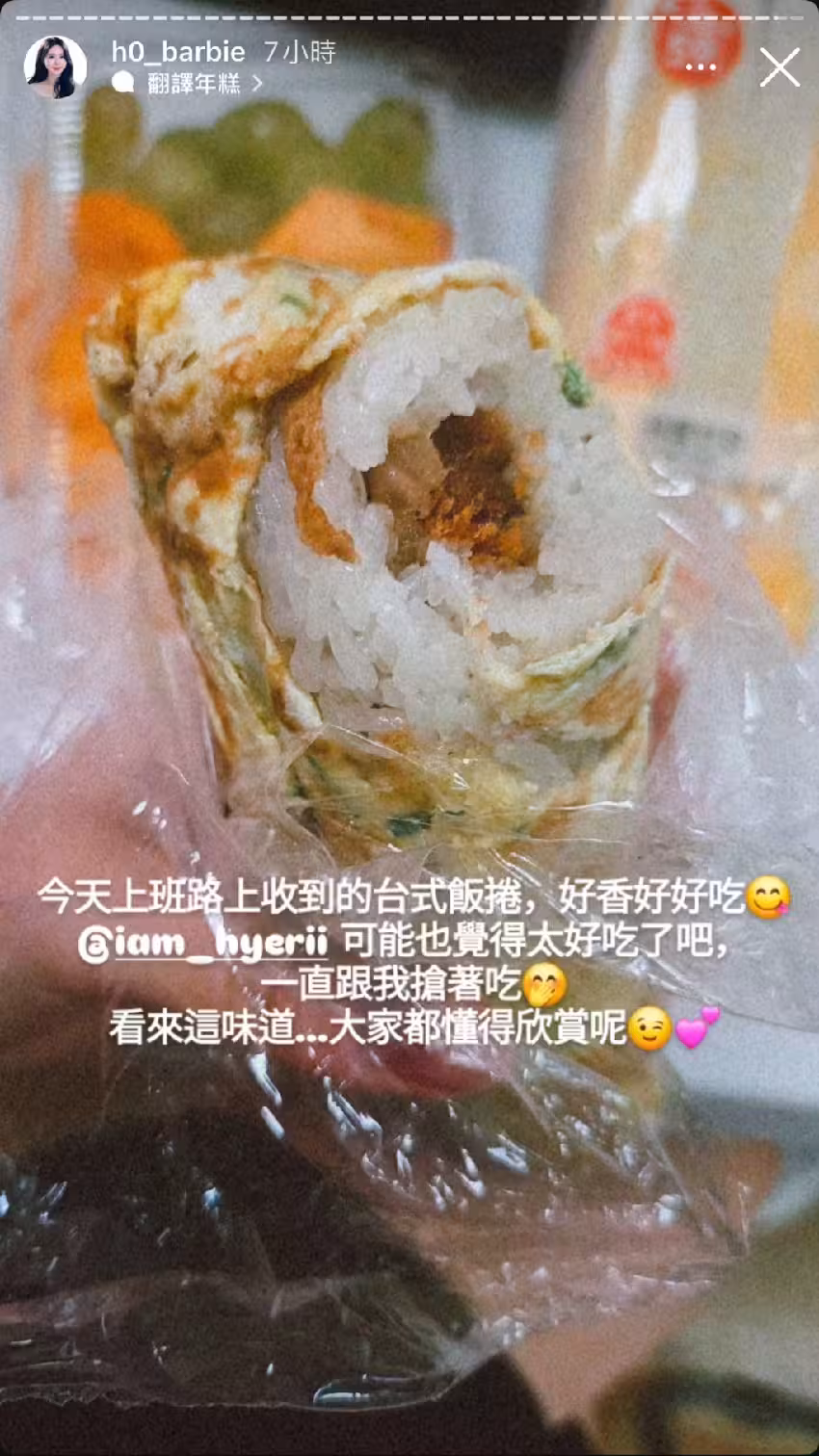 有趣的是,在台灣發展不到半年的金賢姈,日前收到粉絲送的台式飯糰,裡面有肉鬆、菜脯、油條等常見的配料,外面則包上一層蔥花蛋,結果完全符合金賢姈的口味,更稱呼是「台式飯卷」,直呼「好香好好吃」,就連海莉都要搶著吃,「看來這味道...大家都懂得欣賞呢」。