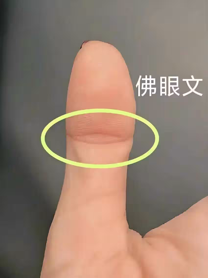 · 大拇指根部有「佛眼」:在大拇指第一個指節處,如果指紋形成一個類似眼睛的閉合圈狀紋路,稱為「佛眼」或「孔子目」。