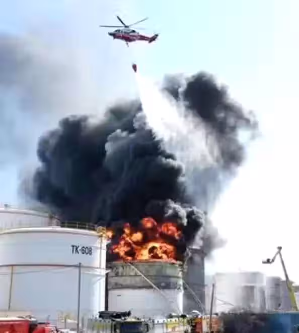 由於事故地點周邊還有4到5座相似的儲油槽,消防人員當務之急就是避免火勢擴散,造成連環爆炸的風險。