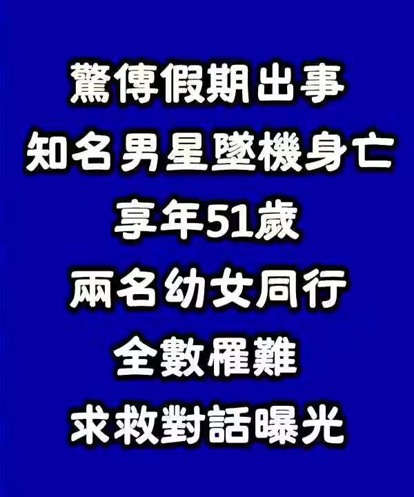 近日驚傳一起墜機空難,包含駕駛員有4人罹難,其餘三人身份確認為知名男星及2名幼女,事發前對話曝光,噩耗震驚演藝圈!