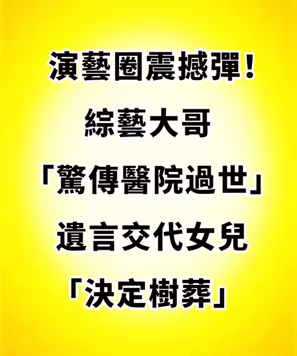 演藝圈震撼彈!綜藝大哥「驚傳醫院過世」 遺言交代女兒「決定樹葬」!