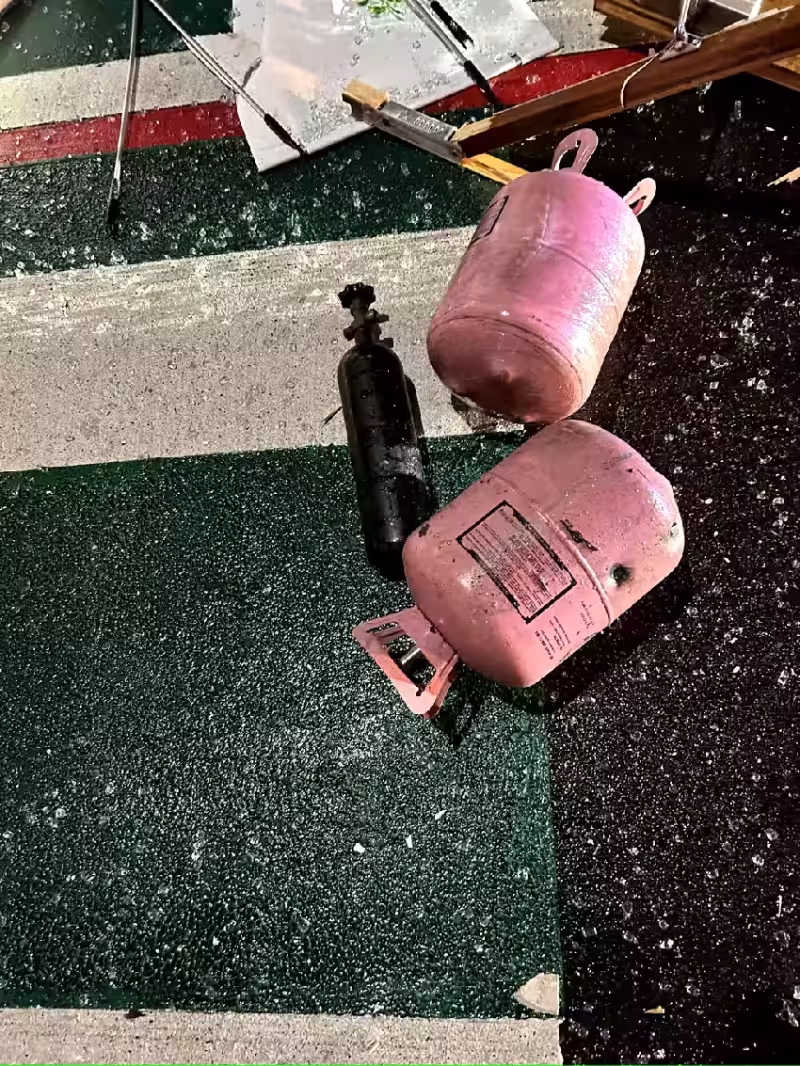 現場為一棟5層樓建築物,起火層為餐館一樓,燃燒面積為一平方米,用餐區的冷氣室內機及冰箱通通遭殃,店內物品被炸飛到馬路上,內部還冒出白煙、十分駭人,火勢約在10分鐘左右撲滅。