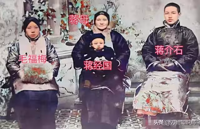 這張照片就是毛福梅和蔣介石一家的合影,此時蔣經國剛出生不久,蔣介石看上去也還是乳臭未乾的模樣,毛福梅的容貌雖說不算驚艷但也十分端正。