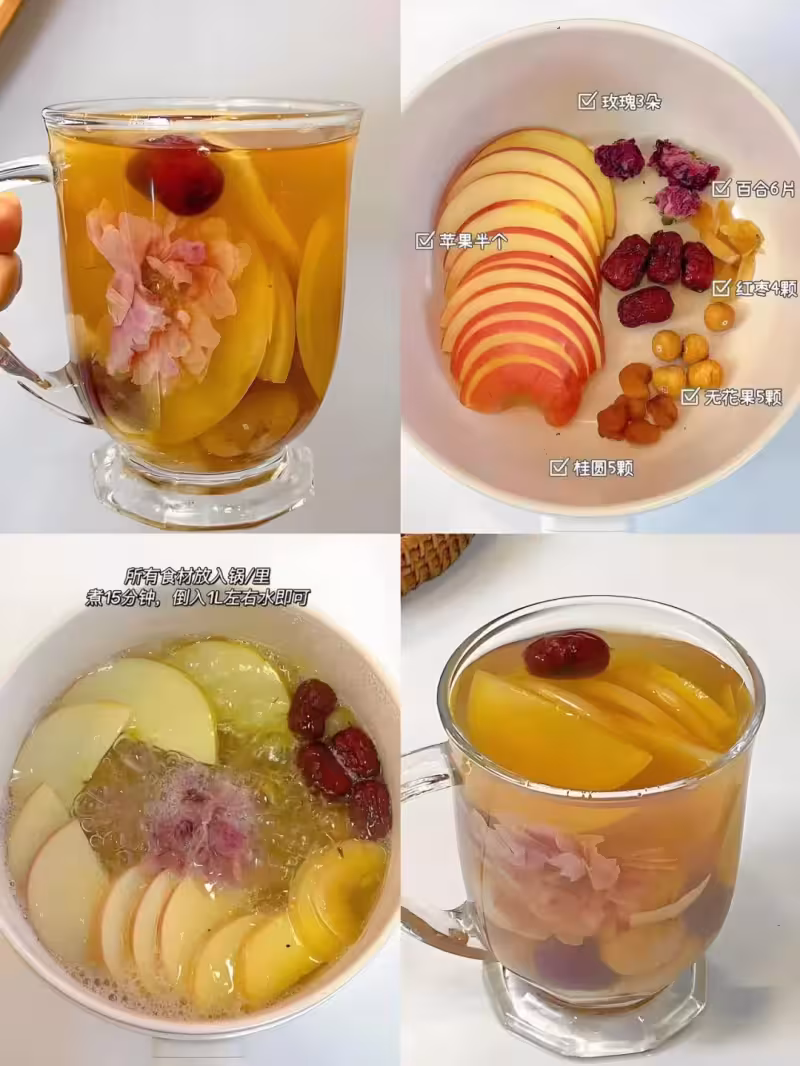 ✔️食材:蘋果半個、玫瑰3朵、百合6片、紅棗4顆、無花果5顆、桂圓5顆