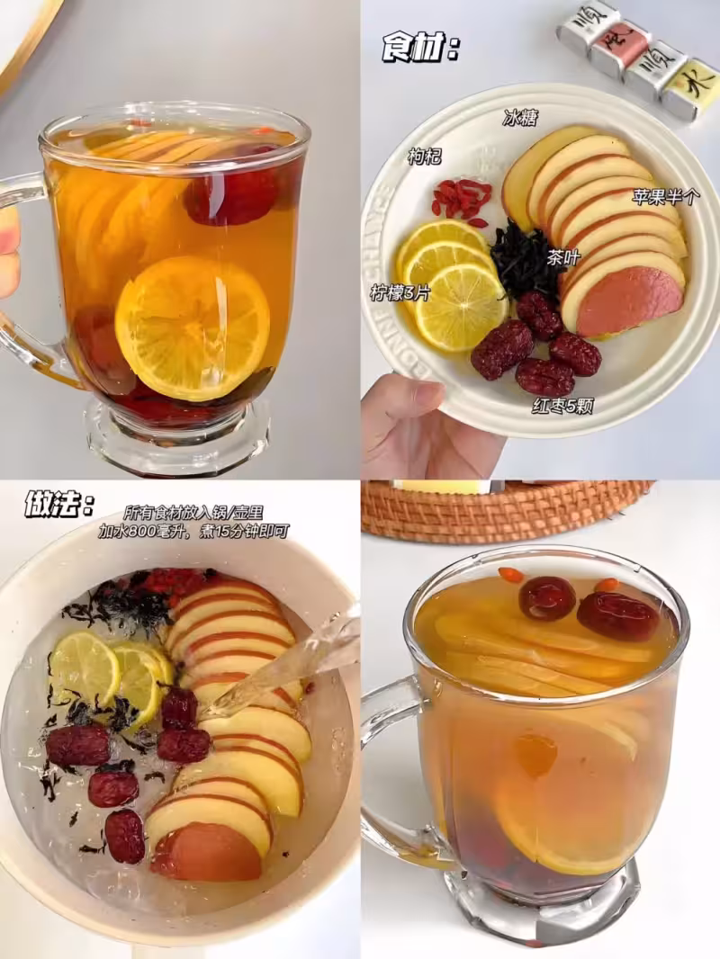 ✔️食材:蘋果半個、冰糖、枸杞、檸檬3片、茶葉、紅棗5顆