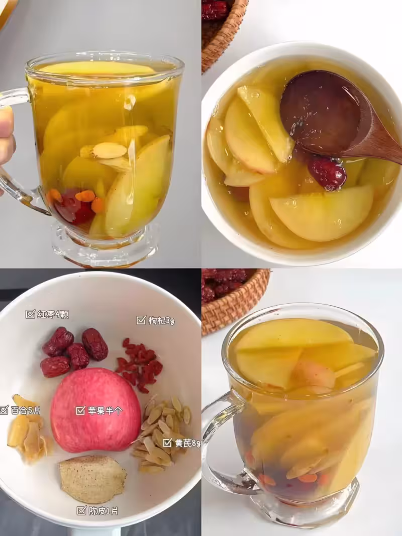 ✔️食材:蘋果半個、百合5片、紅棗4顆、枸杞3g、黃芪8g、陳皮1片