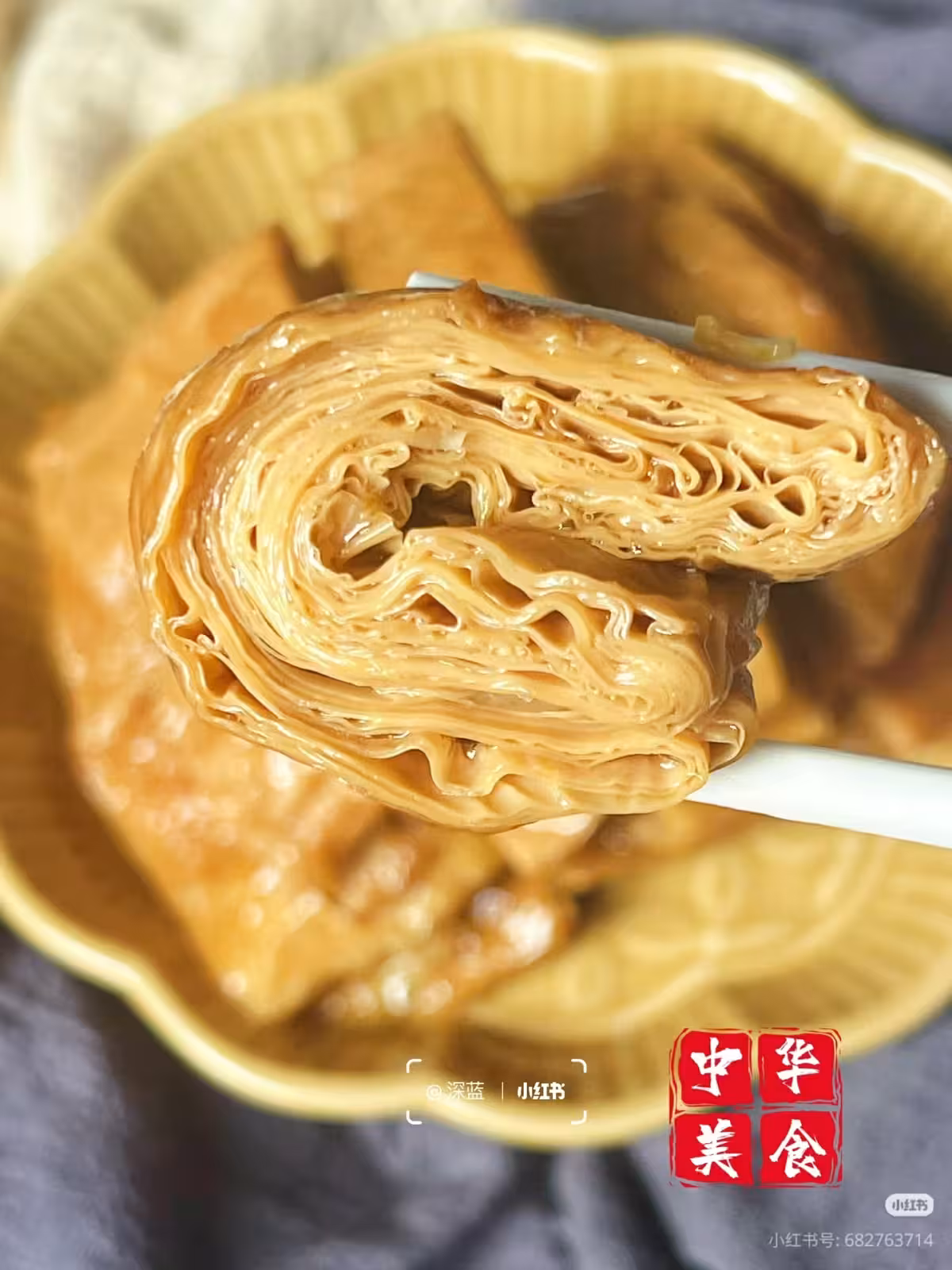 ❷需要把豆腐皮整張浸泡到醬汁中,這樣才入味