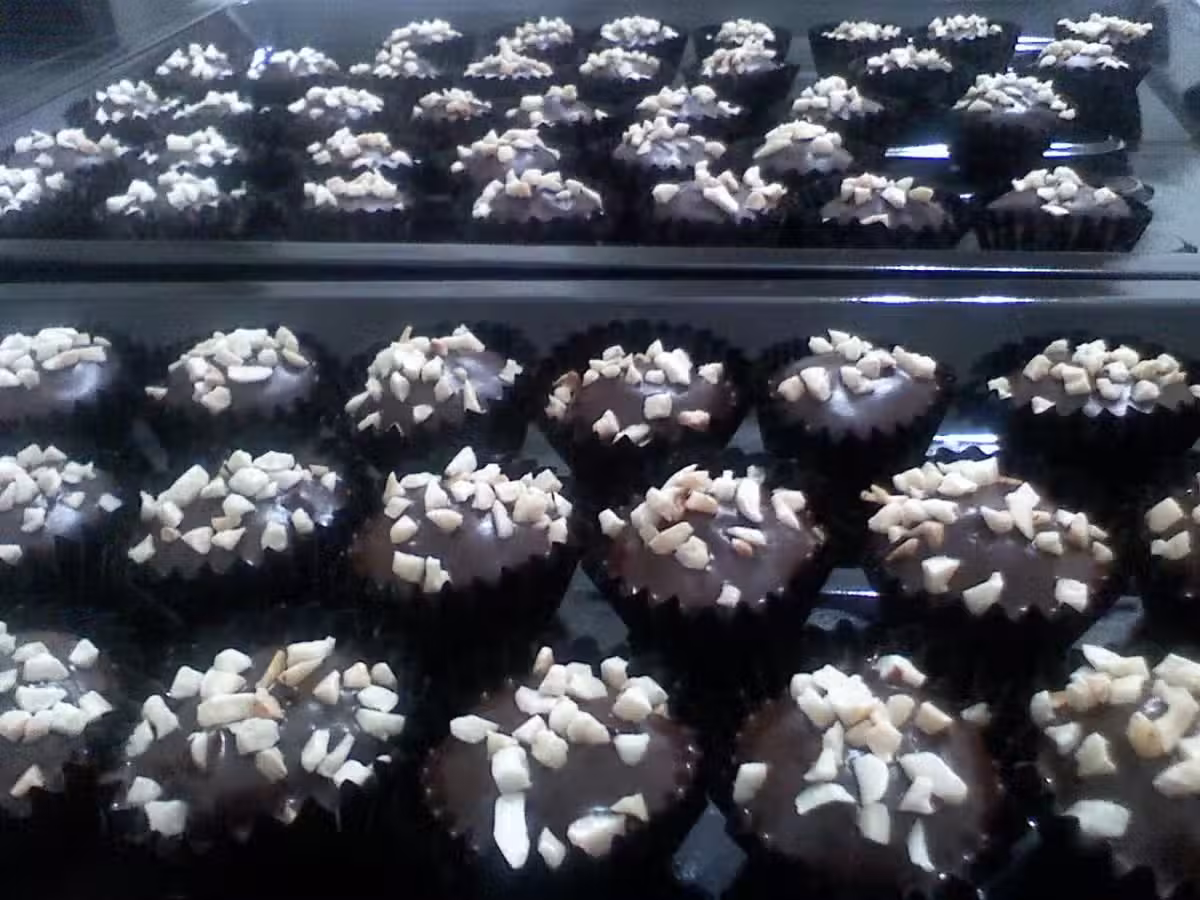 6.把餅乾放入巧克力糊, 再放入小紙杯, 然後在上面放上杏仁碎