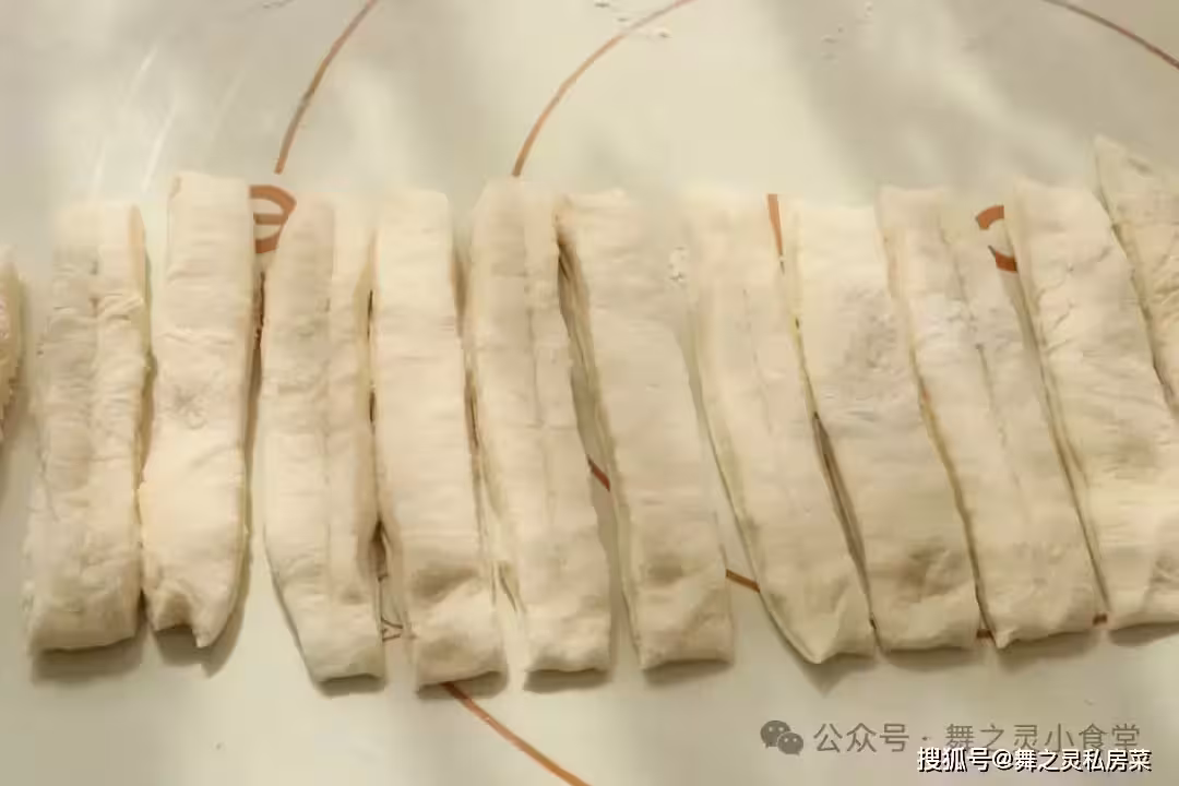 第五步:然後將另一片沒有壓痕的麵糰疊加上去,用筷子按壓下去就是油條雛形了。