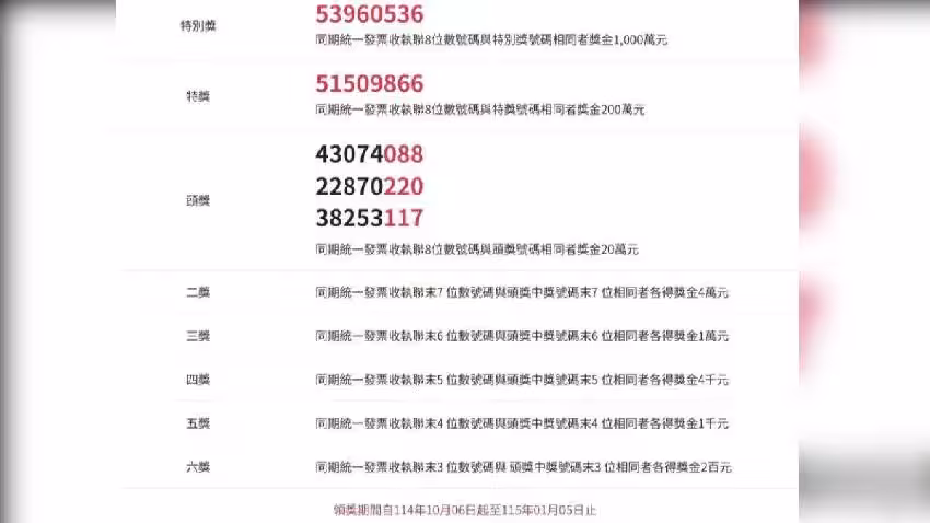 至於200萬元特獎,尚未領取的共有3張,分別為App Store訂閱費220元、彰化縣鹿港鎮鹿和路一段271號的統一超商,購買食品消費132元,以及台南市歸仁區保大路三段258號「茶の魔手」,購買飲料消費30元。