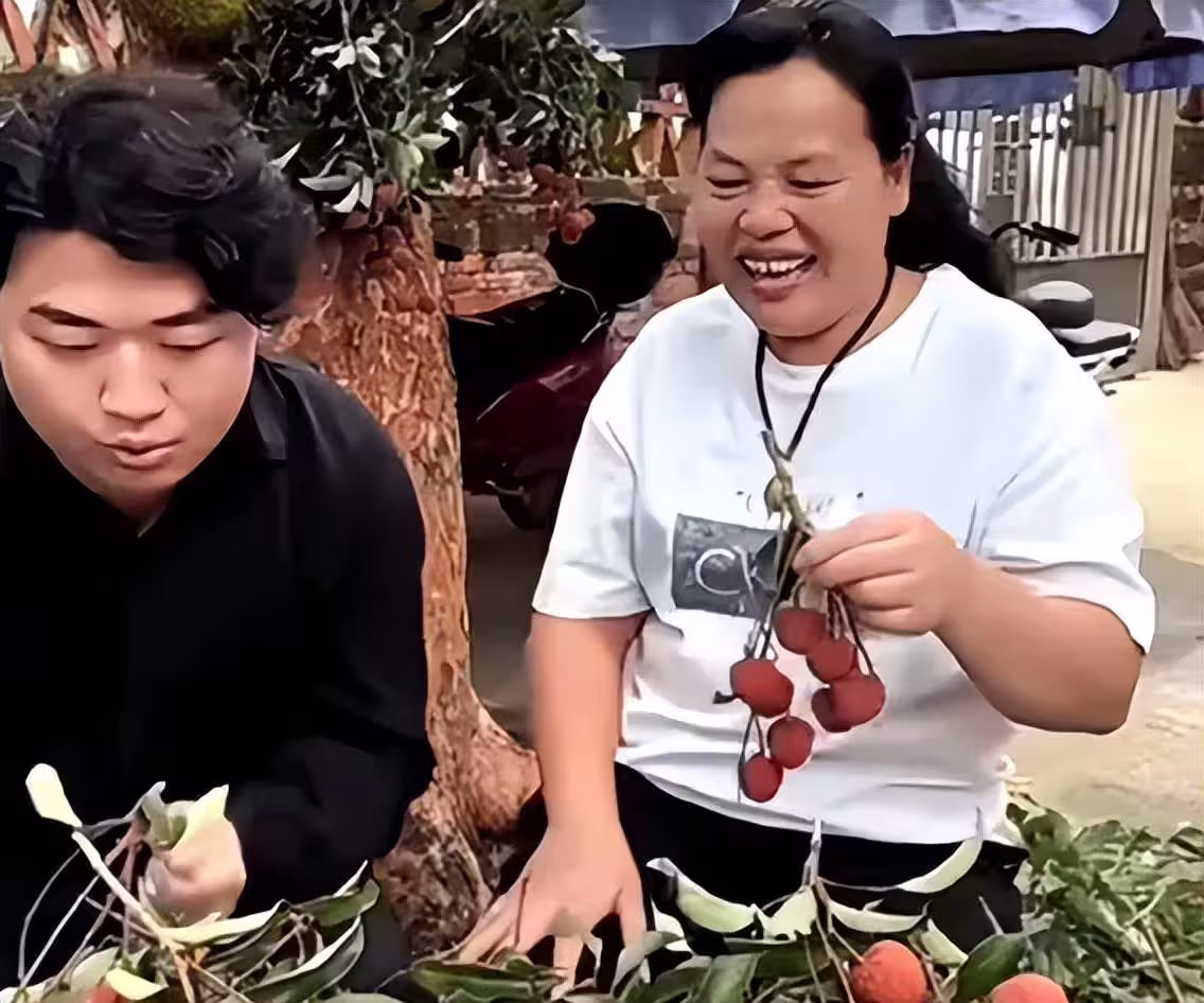對著身旁正熱情帶貨的兒子開玩笑道: