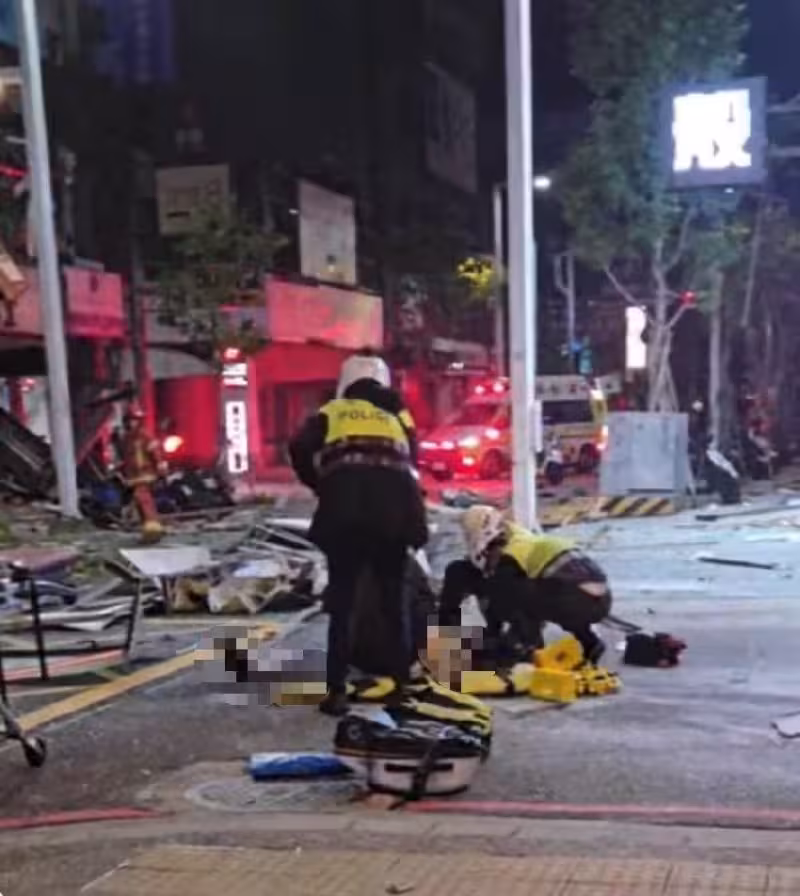 當時路過的女子4人、男子1人遭碎片砸傷,在場還有人慘遭炸出的碎片「擊倒」,躺在地上被緊急救治,現場一時宛如戰場。 事發現場慘狀。