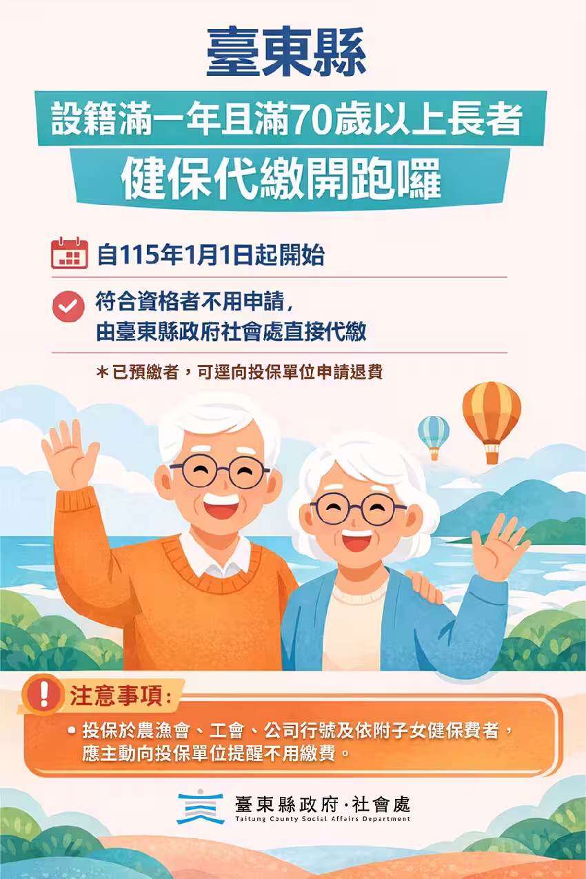 不過社會處提醒,「依附於子女名下」或「農漁工會投保」的長輩,務必主動向投保單位告知「符合代繳資格,無須繳費」,若健保費已經預收,應向所屬投保單位說明,並洽詢退費事宜,以確保權益。