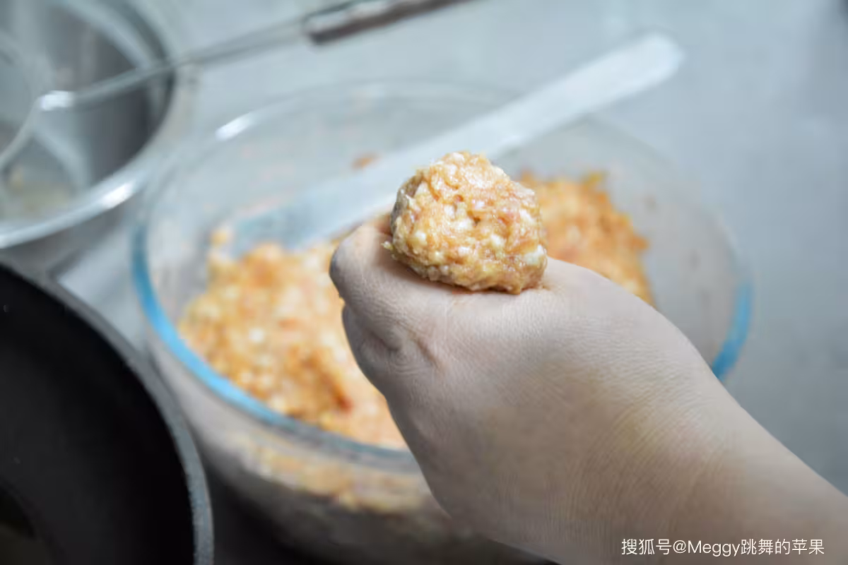 9. 油鍋中火加熱,放一點點肉餡入鍋,能迅速浮起來說明油溫合適;手攥一把肉餡,從虎口處擠出成丸子狀,用小勺挖出入油鍋;如果不會用手擠丸子,可用勺子舀肉餡,或者兩手之間倒一倒成球狀;
