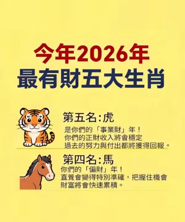 今年2026年最有財的五大生肖
