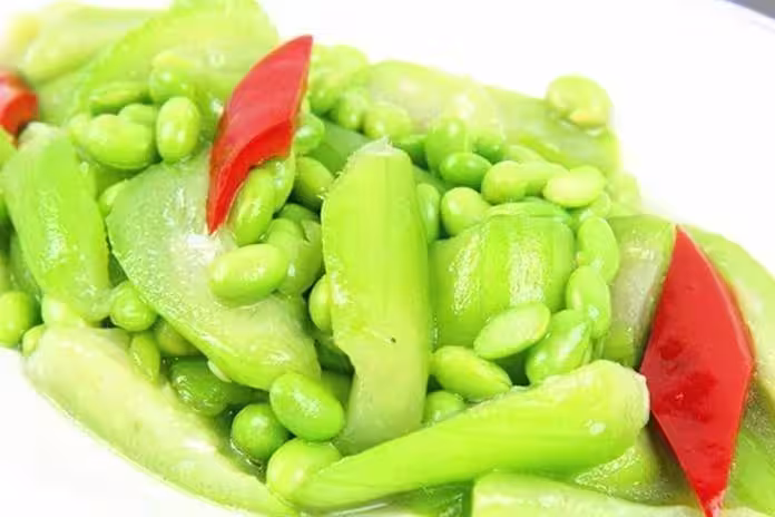 二、毛豆推薦做法:【絲瓜炒毛豆】1.準備絲瓜一根,颳去外皮,切成均勻的滾刀塊放在盆中,加入一勺食鹽浸泡幾分鐘,防止絲瓜在空氣中氧化變黑。