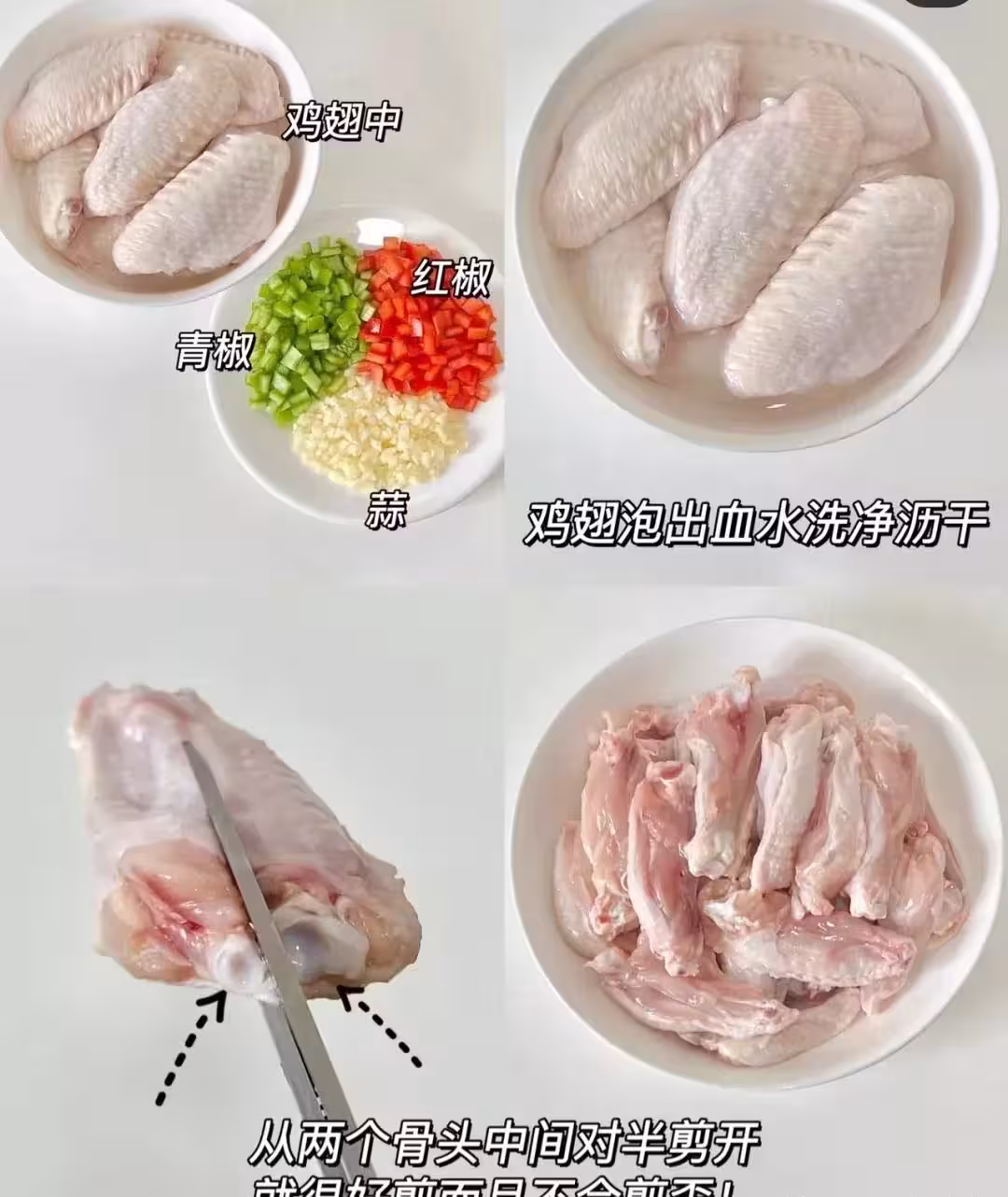 ③鍋中倒入蒜末炒香,然後倒入雞翅,加一勺生抽,翻炒均勻。然後倒入青椒丁,紅椒丁翻炒均勻入味即可出鍋。