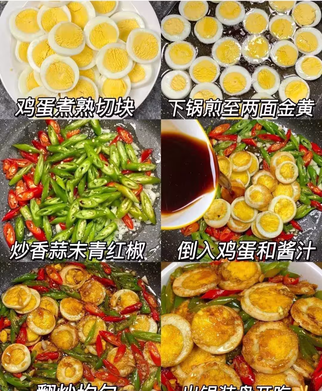 ④熱油炒香蒜末,青紅辣椒放入蛋片,加入兩勺生抽,一勺蚝油,少許鹽和雞精調味,翻炒均勻即可。