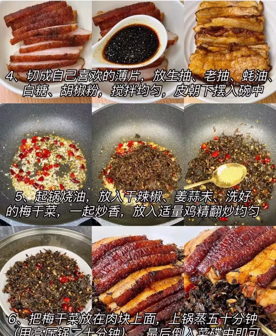 ⑥然後把五花肉切片,一片片沾滿料汁,皮朝下擺入碗里,五花肉擺好盤後,梅菜乾放在五花肉的表面,放入鍋中小火蒸兩個小時,吃的時候倒扣過來就可以了。