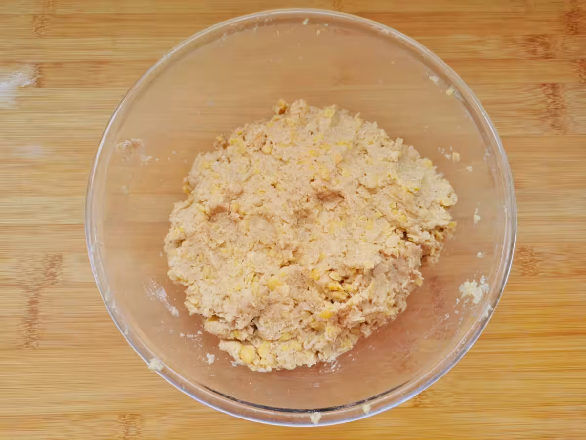 4、碗中倒入壓碎的鷹嘴豆泥,加入100克黑全麥麵粉,再加入100克清水翻拌成麵糰。