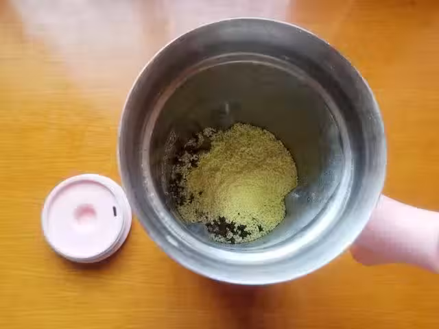 6、打好的椒鹽用網篩過篩一次,這樣會得到更細膩的粉末,過篩完後留下的粗顆粒可以倒回料理機繼續攪打