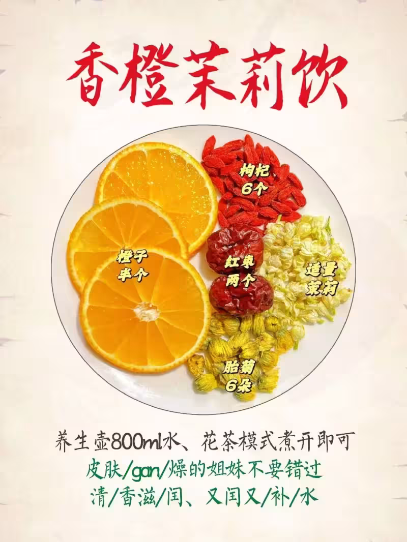 4個橙子片、6顆枸杞、兩顆紅棗、6朵胎菊,橙子切片不用剝皮,紅棗掰開,熱水一衝就行,這個我喜歡早上起來喝,橙子的香氣特別提神,枸杞和紅棗讓氣色看起來不那麼蒼白,茉莉花香混著橙子味,喝起來心情都好了。