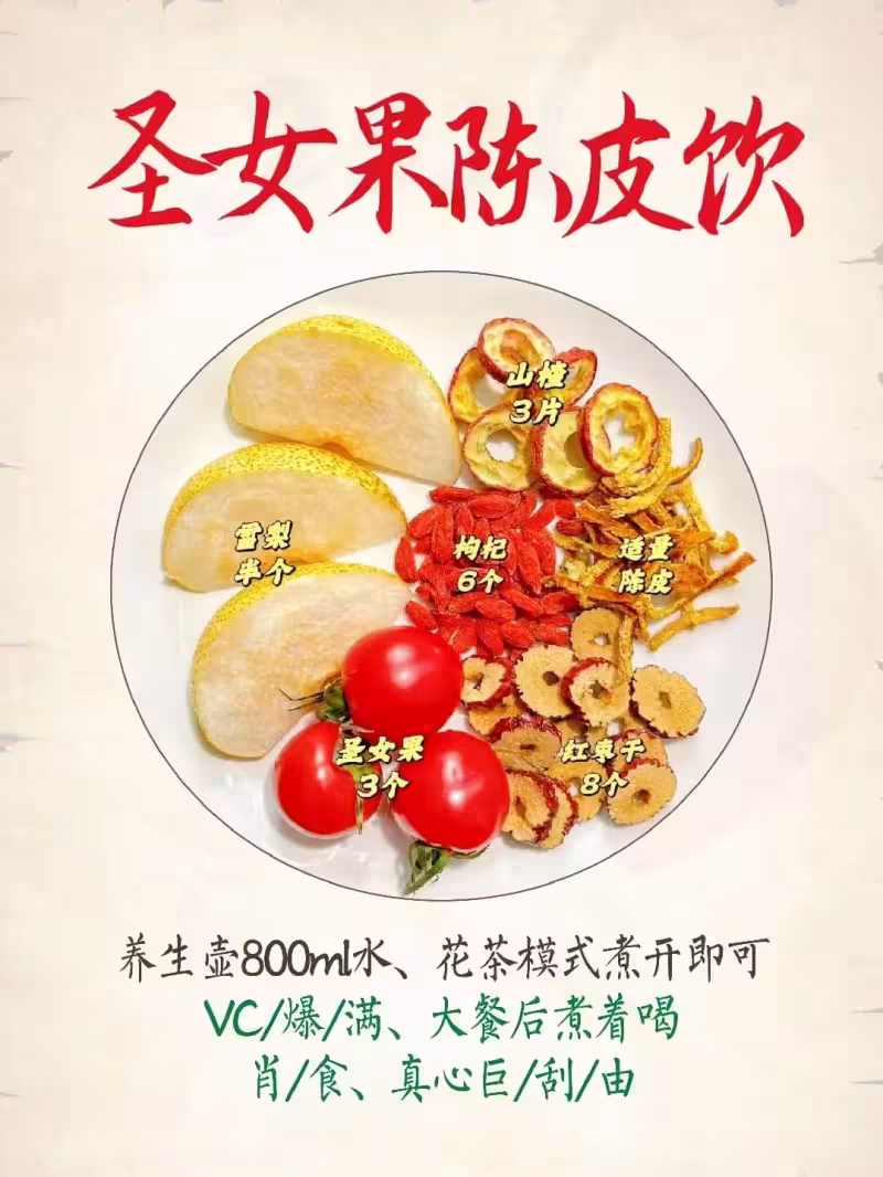 3片雪梨、3片山楂、6顆枸杞、3朵玫瑰、3顆聖女果,雪梨帶皮切,山楂切小塊,聖女果對半切開,開水燜20分鐘就行,這個我覺得特別適合大餐後煮著喝,山楂刮油,陳皮理氣,玫瑰養肝,喝完肚子不會那麼脹,真心巨刮油的感覺。
