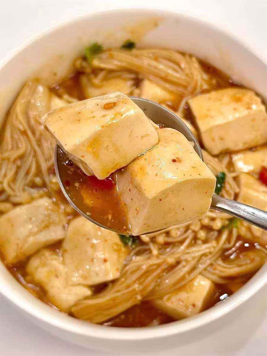 豆腐金針菇煲,豆腐滑嫩,醬汁微微辣,解饞又低卡!