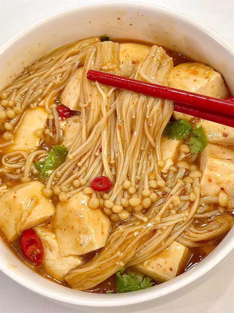 豆腐金針菇煲,豆腐滑嫩,醬汁微微辣,解饞又低卡!