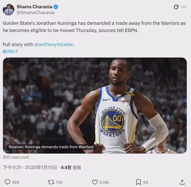1月15日晚11點半,據NBA名記Shams報道,庫明加正式向勇士隊提出交易申請。值得一提的是,今天也是庫明加「交易解封」的第一天。跟教主預想的一樣,庫明加跟勇士迫不及待想分手了,因為他已經連續13場比賽被DNP!