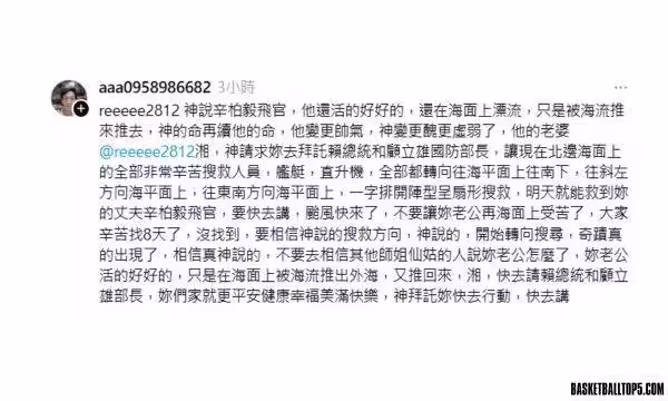 宣稱辛員「仍在海面漂流」,並表示「神指示」搜救應往特定方向調整。