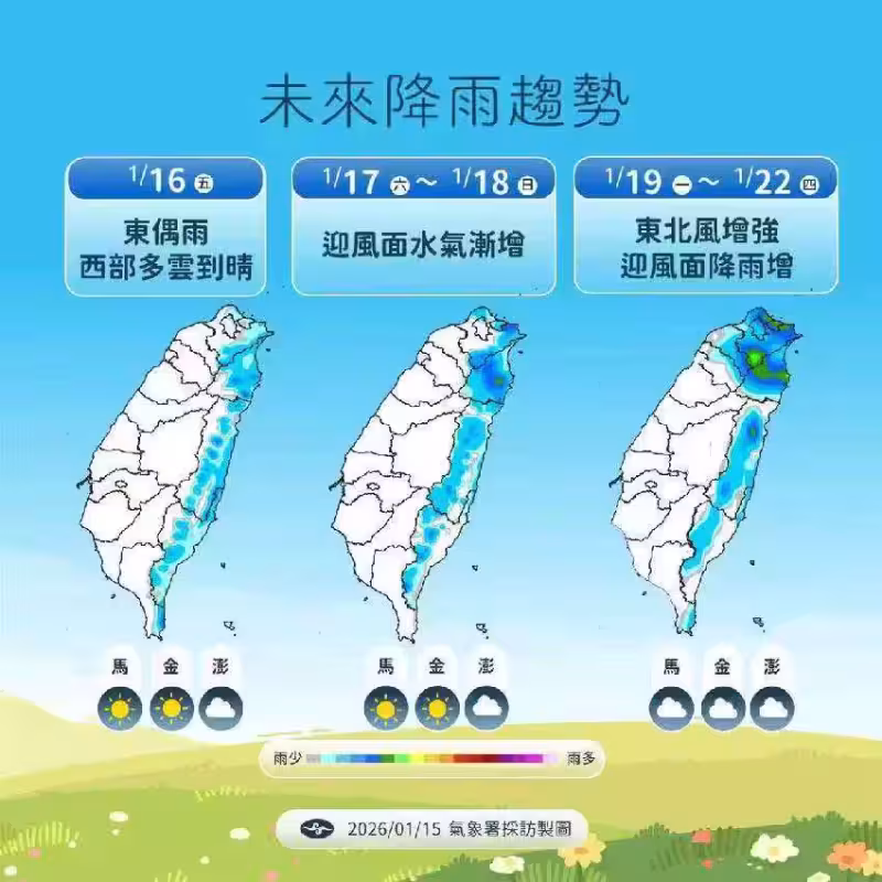 這波冷空氣預計到 24 日、25 日才會逐日減弱,屆時氣溫將緩步回升,但迎風面地區仍可能有局部短暫雨。